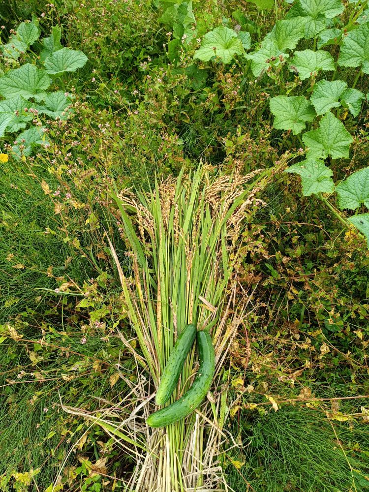 田んぼの畔に実っていたラッキーキュウリ!昼ごはんはキュウリサラダに決定!